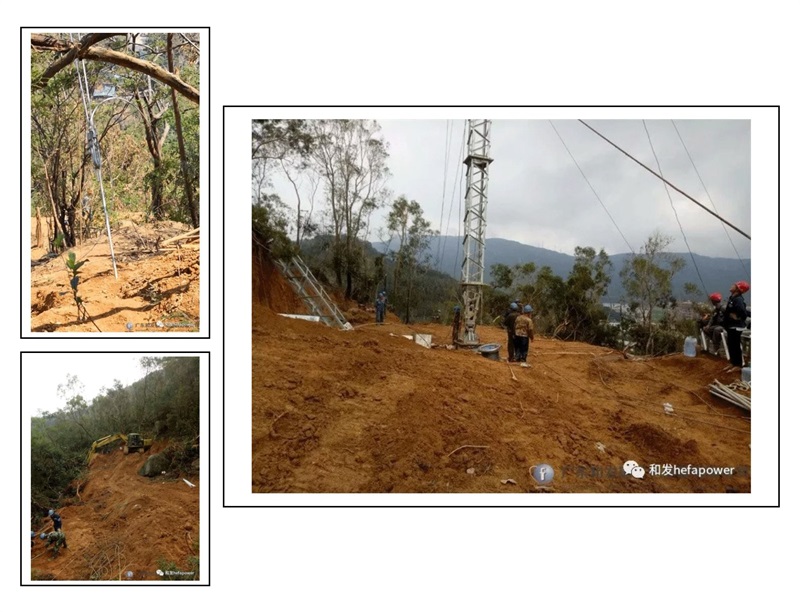 廣東和發(fā)輸變電安裝有限公司接到搶修指令后,ERS搶修隊(duì)馬上進(jìn)行人員轉(zhuǎn)移、車輛部署和大型機(jī)械等材料物資的轉(zhuǎn)運(yùn)、后勤到崗部署,和發(fā)ERS搶修隊(duì)充分發(fā)揮ERS搶修特性和電力搶修先鋒模范作用,不畏艱險(xiǎn),勇?lián)厝危煤顾椭腔墼忈屃恕皩?shí)干擔(dān)當(dāng)”的責(zé)任形象。用手抬、用肩扛,爬山涉水,在高山里進(jìn)行平整場(chǎng)地及道路清理,轉(zhuǎn)移ERS電力搶修塔、挖地錨坑、搭設(shè)跨越架、拆除故障鐵塔和導(dǎo)地線、臨時(shí)道路協(xié)調(diào)、山體封網(wǎng)、地錨埋設(shè),ERS搶修塔組立……一系列的應(yīng)急搶修步驟有條不絮地進(jìn)行離不開和發(fā)ERS搶修隊(duì)每一位搶修人員的辛勤付出和吃苦耐勞,在夜以繼日的搶修奮戰(zhàn)下,深圳110kV白德線的臨時(shí)供電線路終于在2018年9月29日順利恢復(fù)送電。