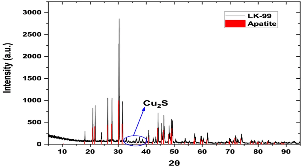 紅線是鉛-磷灰石,黑線是LK-99,可見摻入少量的Cu后,晶格常數(shù)變小了,即材料發(fā)生了收縮。