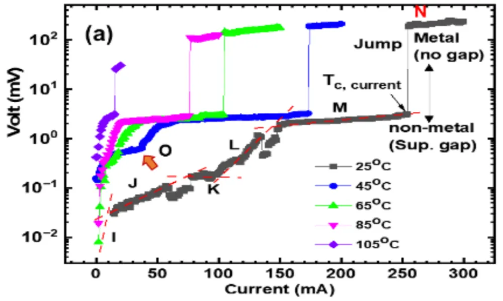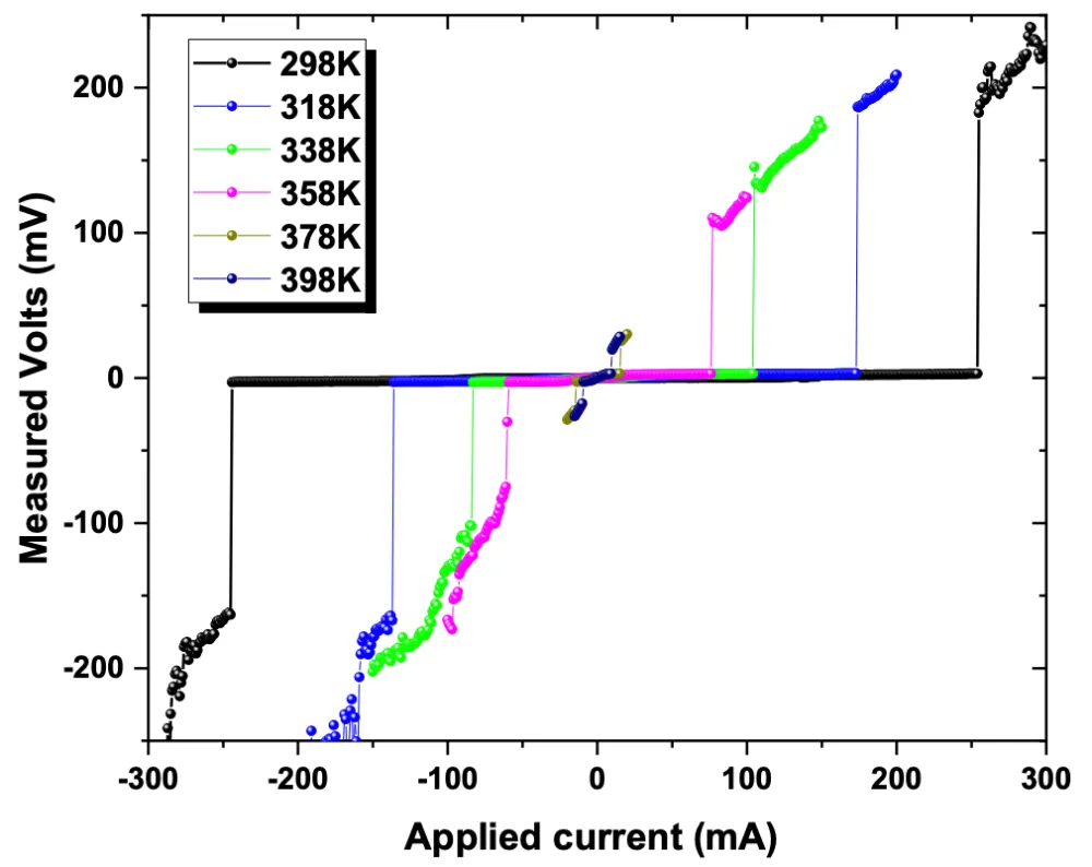 縱軸是電壓,橫軸是電流,可見在室溫區(qū)間,電壓為0時,電流可以不是0。