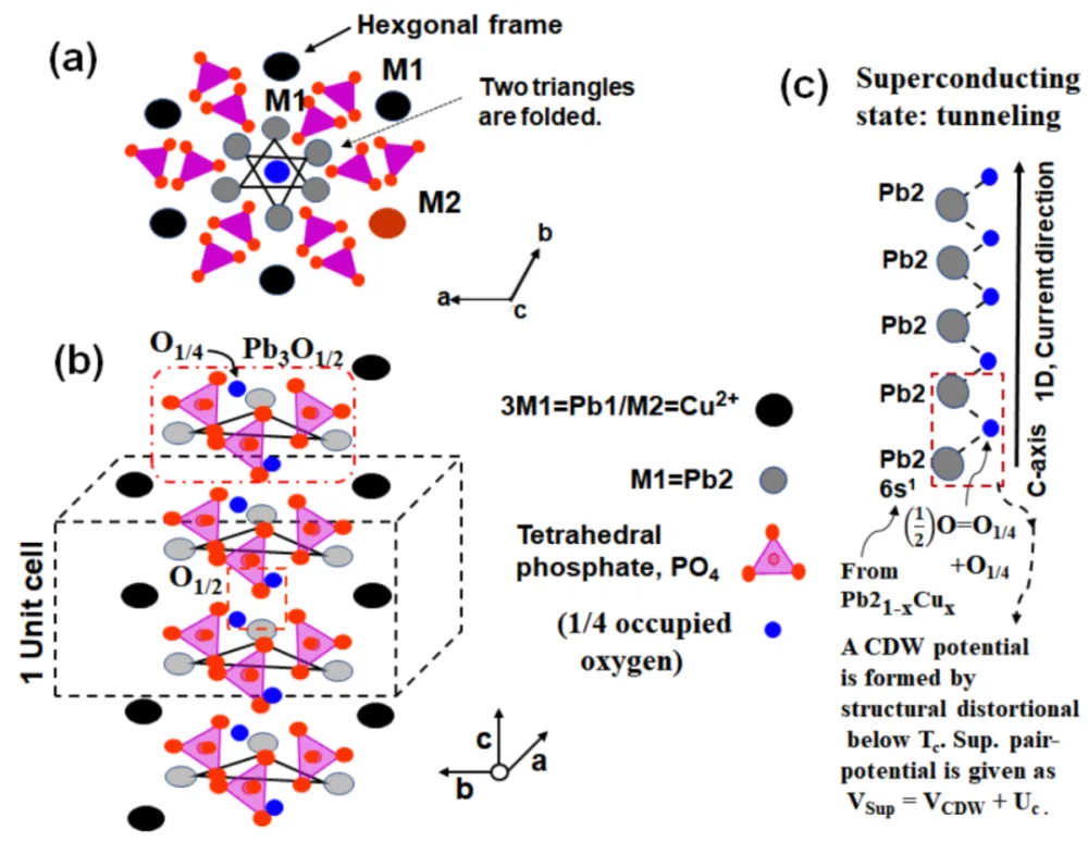 黑球代表Pb1,提供支撐/框架作用,部分被Cu取代后,會產(chǎn)生一個壓縮的效應(yīng),灰球代表Pb2,柱狀排列的Pb2構(gòu)成一個1維系統(tǒng),特定溫度下還可產(chǎn)生電荷密度波(CDW),即電荷的周期性調(diào)制。